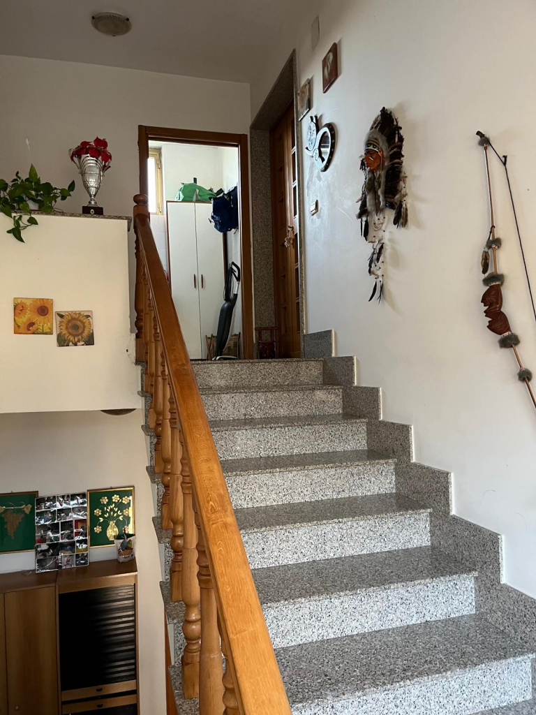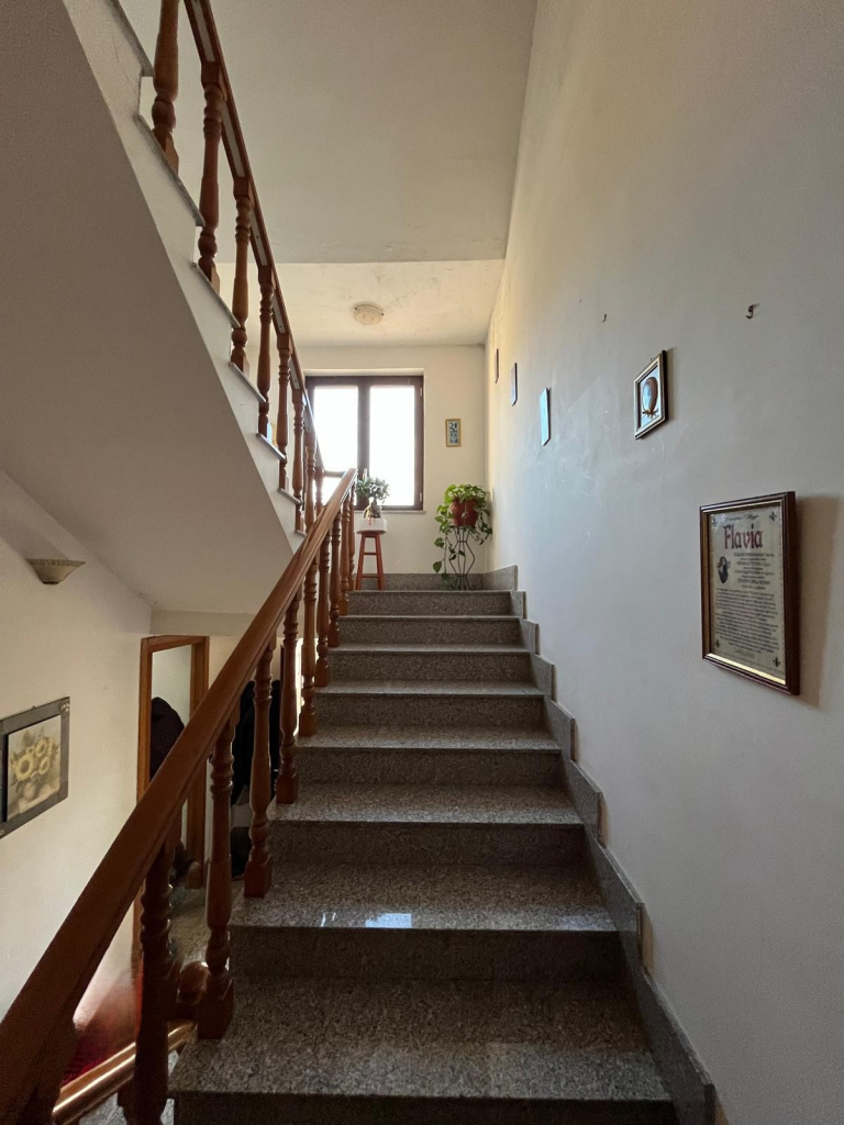 Dalla zona disimpegno al piano terra, tramite due rampe di scala si perviene al pianerottolo su cui si affacciano un due ambienti adibiti attualmente a ripostiglio e lavanderia. Sullo stesso livello, si trova l'appartamento che ci accogli con un grande open-space cucina-salone dotato di camino angolare perfettamente funzionante. Da qui, attraverso una porta a salvaguardia della privacy, si perviene alla zona notte costituita da corridoio di disimpegno, due grandi camere ed un bagno.